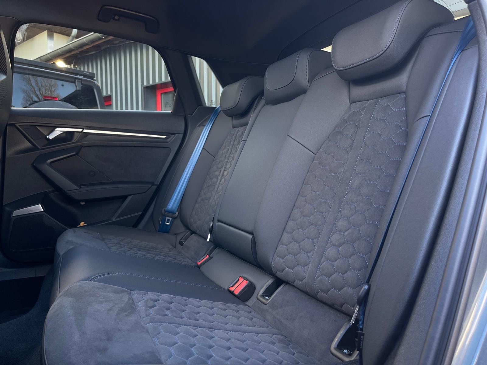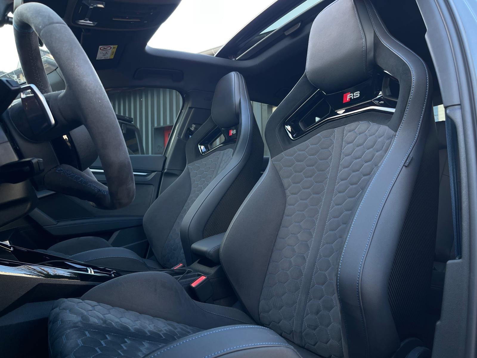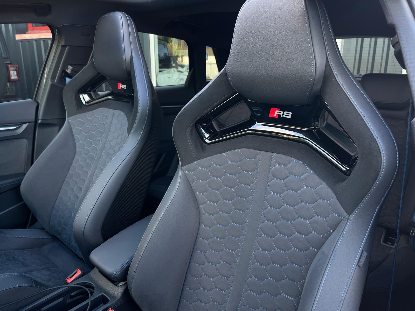 Sièges baquets en cuir perlé Nappa/Dinamica avec surpiqûres RS bleues mercato